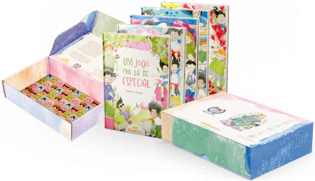 Kit contendo um livro físico de cada título: Um jogo pra lá de especial!, Amor azul! Amor paciente!, Juntos, a caminhada fica mais fácil, Caio, meu irmão com Síndrome de Down e Alerta vermelho! Precisamos nos comunicar!